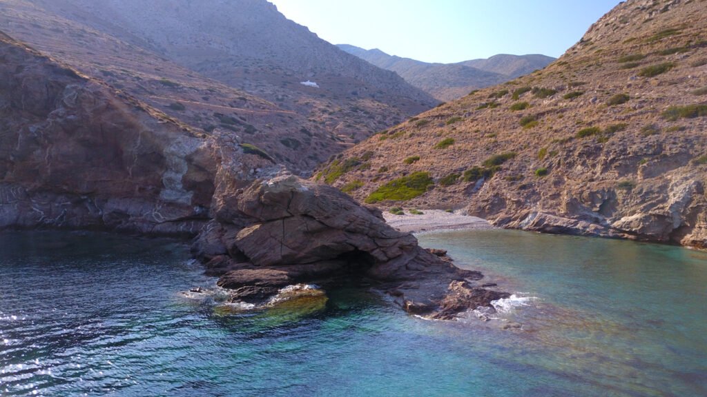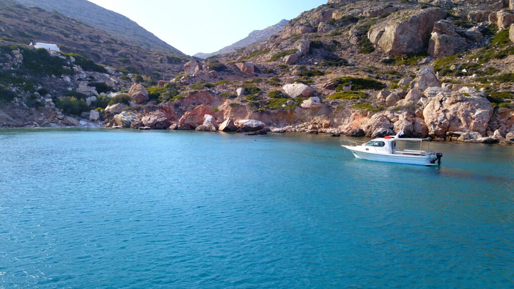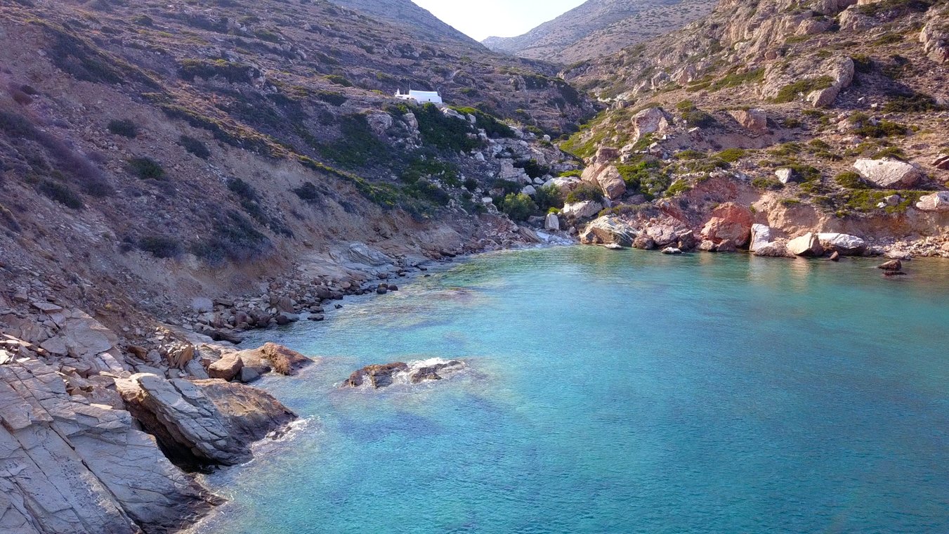 Pebbles, large stones and rocky seabed with crystal clear waters and background behind the whilte church and the bare slopes of Agios Mamas.